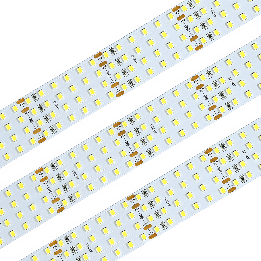 The 24V white LED Strip is engineered with a quad-row design featuring 2835 SMD LEDs, with a dense arrangement of 240 LEDs per meter.