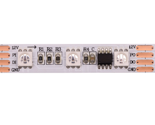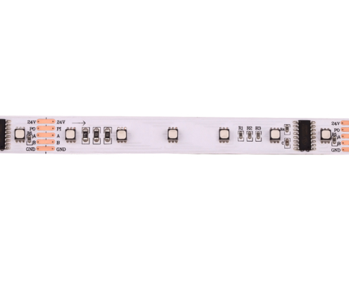 This DMX512 digital smart LED strip light has 60 SMD5050 RGB LEDs and 20 DMX512 driving IC per meter.