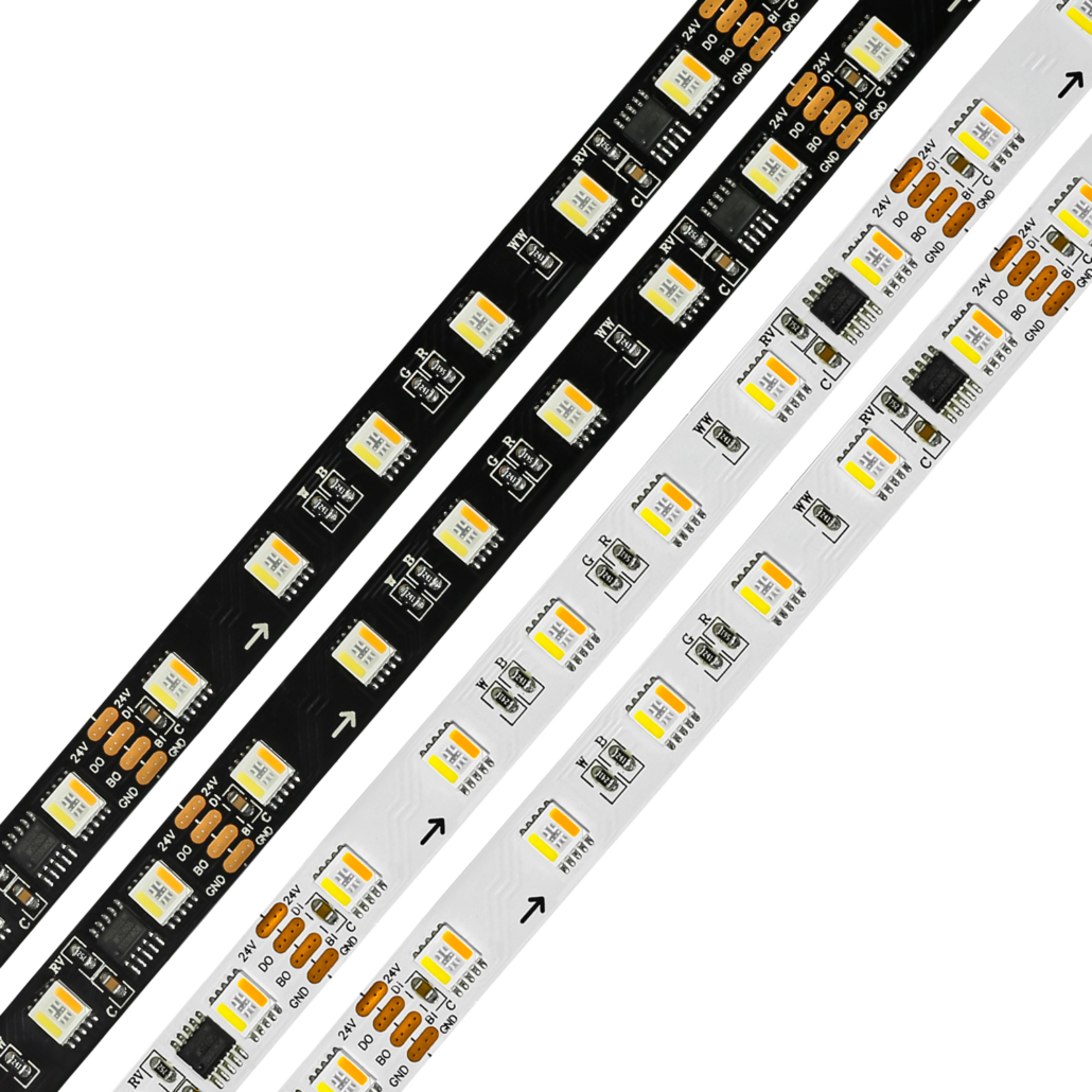 The WS2805 RGBCW smart LED strip light adopts integrated IC design and supports five color adjustments of red, green, blue, warm white, and cool white.